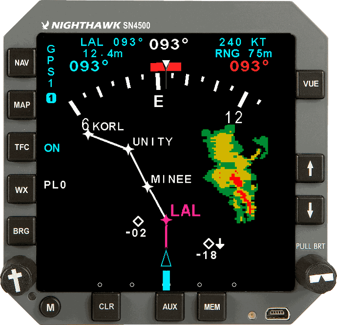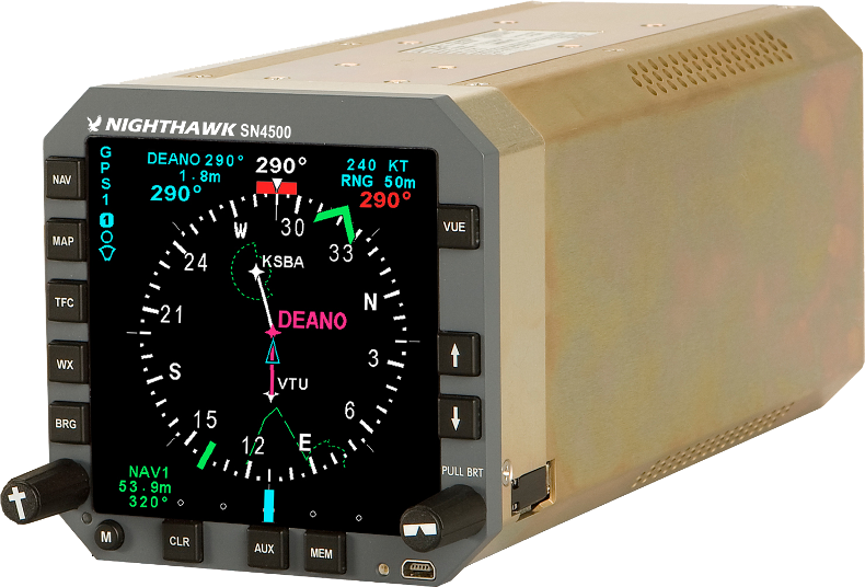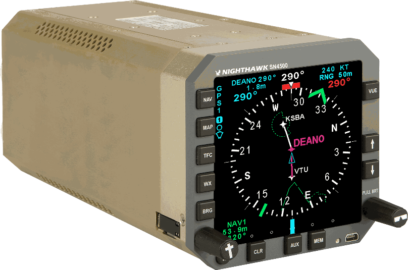 The SN4500 4×4 Primary Navigation Display upgrades your cockpit with the bright, wide-angle display technology found in the latest generation of aircraft. Boasting a high- reliability LED backlight, the SN4500’s display outperforms CRT and LCD screens, yielding unprecedented readability and ease of use. Simplifying navigation, the SN4500 also enhances safety with its standard Stormscope® and traffic. Available with night vision option and TACAN support as well.